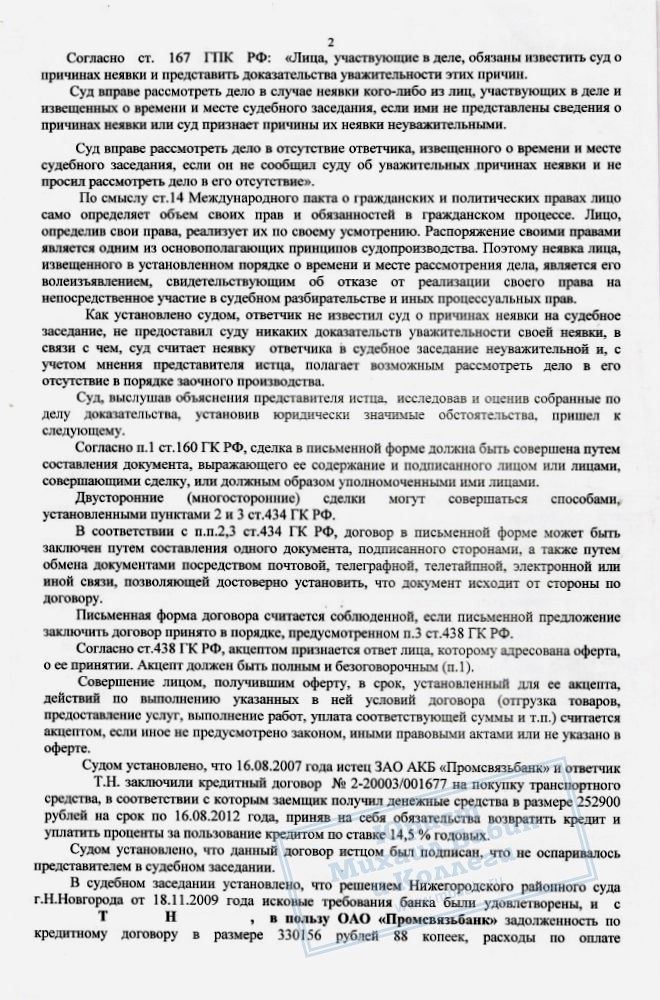 01.10.2012 гражданка Т.Н., интересы которой представляли сотрудники нашей компании, обратилась в суд с иском к ОАО «Промсвязьбанк».