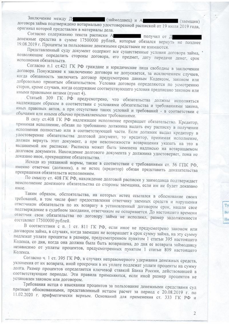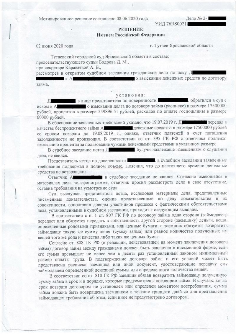 Клиент Д. передал в качестве займа по расписке 17 500 000 руб., однако, после наступления срока возврата займа, заемщик перестал выходить на связь и задолженность не погасил.