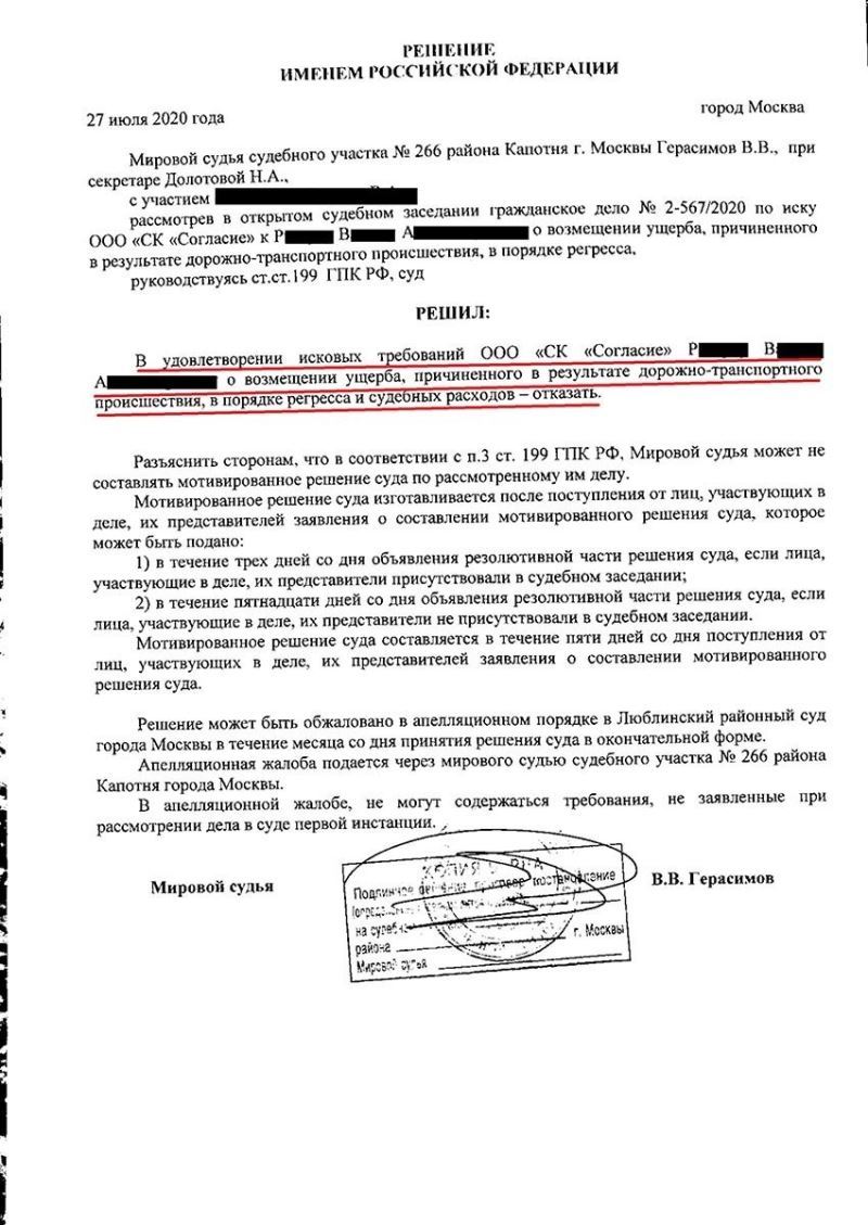 Страховая компания обратилась с иском к клиенту адвоката о взыскании в регрессном порядке денежные средств, компенсированных потерпевшему в результате ДТП, в связи с чем, что клиент не направил в течение 5 рабочих дней после ДТП экземпляр заполненного совместно с потерпевшим бланка извещения о ДТП.
