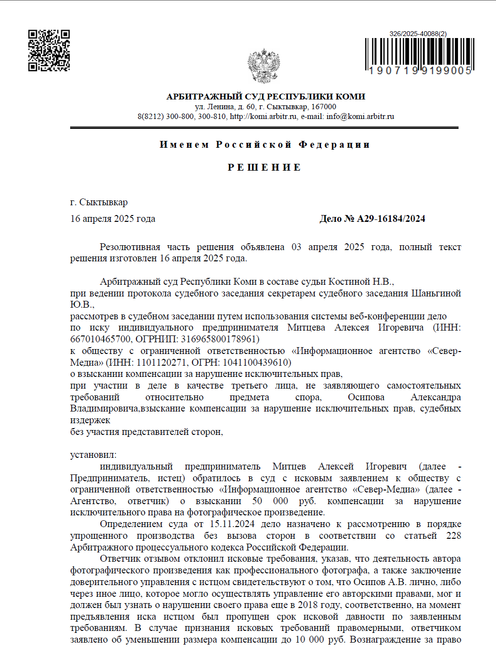 Арбитражный суд Республики Коми полностью удовлетворил наши требования. Суд признал, что использование фотографии без указания имени автора (Осипова А.В.) не может быть признано свободным цитированием, а срок исковой давности не пропущен.