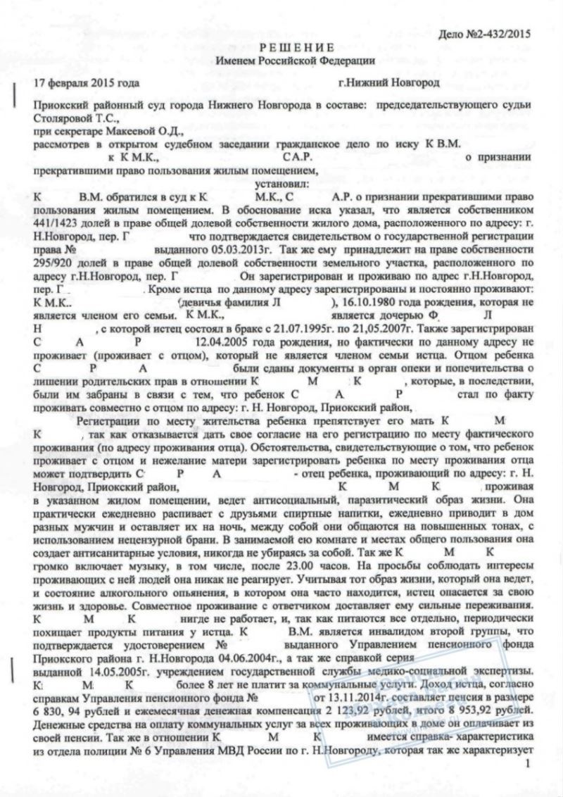 Пенсионер К. в течении 8 лет был вынужден жить в квартире со своей взрослой падчерицей, которая сделала совместное проживание с ней невыносимым. Она регулярно распивала спиртные напитки, приводила мужчин, устраивала скандалы. При этом родственница нигде не работала, и не только не платила за квартиру, но и воровала у пожилого мужчины продукты, которые он покупал на свою небольшую пенсию. К. не мог выселить женщину из квартиры, так как с нею был прописан её несовершеннолетний сын. В опьянении она вела себя агрессивно, так что К. начал опасаться за свою жизнь и здоровье. Потеряв терпение, он обратился за помощью к нашим юристам.